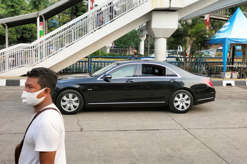 Joko Widodo Presiden memantau pembagian bantuan bahan pokok dari dalam mobil yang disalurkan bagi warga di Terminal Grogol Petamburan Jakarta Barat pada Selasa, tadi. Dari pantauan Antara, Jokowi tiba di Terminal Grogol Petamburan sekitar pukul 16.13 WIB yang dikawal Pasukan Pengamanan Presiden (Paspampres).
