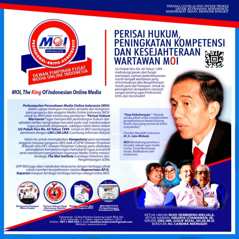 “MOI memiliki komitmen untuk mengangkat harkat dan martabat para wartawan. Meningkatkan kompetensi mereka agar dapat menjadi wartawan yang profesional, kritis dan konstruktif,” tegas Sekretaris Jenderal Perkumpulan MOI, HM. Jusuf Rizal di Jakarta.